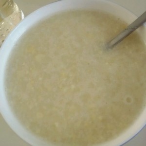 水烧开后将玉米泥倒入水中,用勺子搅拌直至冒泡,持续一分钟就可以盛出,用中等的火量即可。