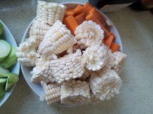 玉米、胡萝卜洗净。玉米切断、胡萝卜切条备用