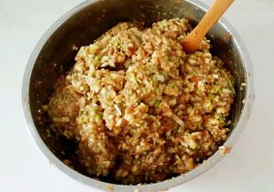 肉馅、虾仁、鸡蛋、葱、姜、蒜沫、花椒油、耗油、老抽酱油全部准备好。
