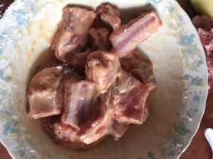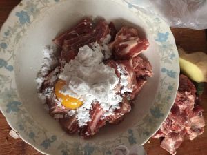 排骨腌好后,把葱姜拿掉,放入淀粉,打入一个全蛋,抓匀