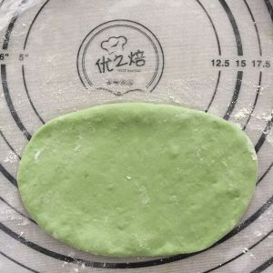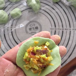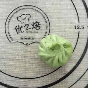 面团材料全部混合均匀,加入菠菜汁和水,喜欢颜色深的就多加菠菜汁少放水,喜欢浅的或怕菠菜口味重不喜欢的,少放菠菜汁多放水,总之颜色自己喜欢的就行,稍深些蒸出来会好看,揉光滑放温暖处发酵至两倍大
