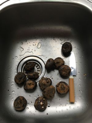 从菜场买回的荸荠是这样的。先用小刀去除头部,再用小刷子刷净表面,或用钢丝球在流水下刷更省力省时,并且不会破坏表皮。