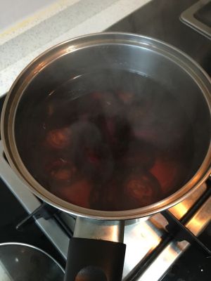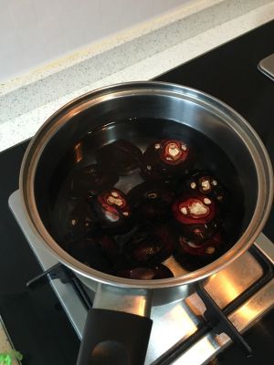 半小时后,水颜色变深红色,关火。打开盖子,一股浓浓的独特香味