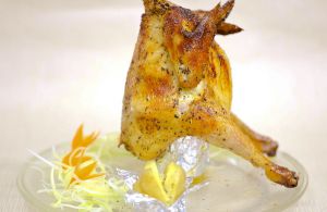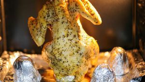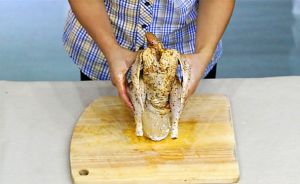 腌制完用厨房纸抹干,先用橄榄油涂遍鸡的全身,再将剩余的调料(盐之类的)均匀抹上去。