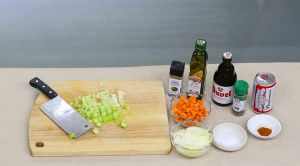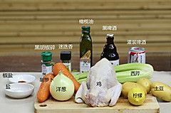 鸡记得要洗干净,然后洋葱切丝、胡萝卜切粒、西芹取3瓣叶切粒即可。剩下的胡萝卜可以雕花,西芹可以切细丝装饰。