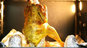 然后到这肯定很多疑问为啥不直接国外的黑啤酒瓶,因为找不到矮的,都很高。再然后把鸡屁股套入啤酒罐上,放入预热好的烤箱里。