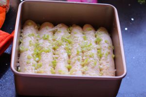 二发完毕,表面刷牛奶,撒香葱碎和白芝麻。烤箱175度预热,20分钟左右。具体时间温度参考自家烤箱。