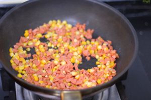 先做馅料(香肠2根,玉米粒一小把,食用油少许,胡椒粉少许),香肠切小丁,热锅放一点油,倒入香肠丁和鲜玉米粒翻炒至八成熟,出锅前加少许胡椒粉;