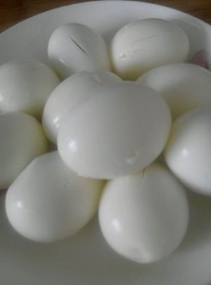 鸡蛋煮熟后切口待用,蛋别切透了。