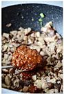 把牛肉丁和香菇丁放进去,不断翻炒