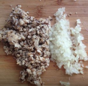 将洋葱和剩下的白蘑菇切碎