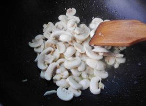 再将蘑菇片倒入,一直搅拌,煮至汤变得浓稠