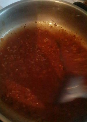 加入四勺豆瓣酱,看个人喜好,我做的比较稀。 放入酱后,慢慢不停的搅拌,以免糊锅底,稀释一下水,三五分钟即可出锅