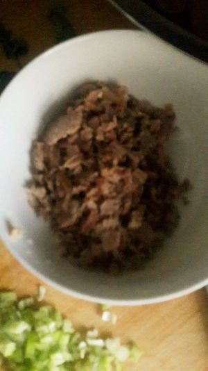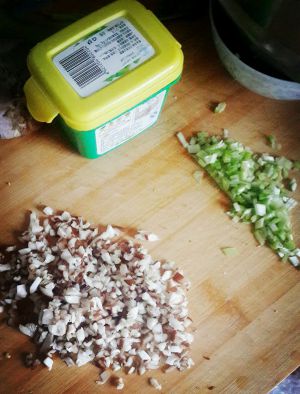 放入葱花呛锅,放入切好的肉末和香菇。略炒,加水,炖十分钟左右,香菇熟透