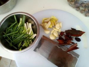 放入大蒜干辣椒,葱白,生姜。桂皮,八角炒出香味,倒入生抽老抽上色,翻炒