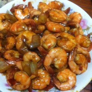 热油,放入洋葱头,豆瓣酱,爆香,放入腌制好的虾,这时候盐可放可不放,根据自己的喜好吧,等到虾子变色,出锅。