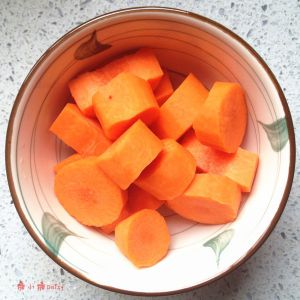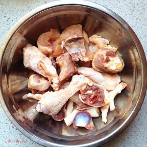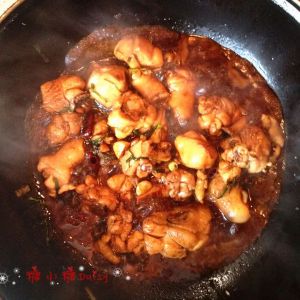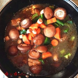 锅中加水没过鸡块,加黄冰糖、香菇、胡萝卜、青椒,大火烧开后转中火焖煮30~40分钟。