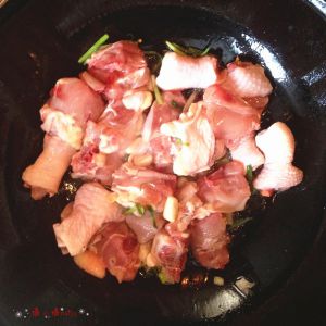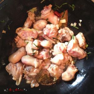 煸炒至鸡块发白,加黄酒、生抽、老抽煸炒上色。