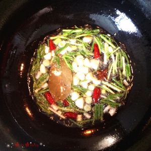 锅烧热加油,待油7分热时,小火下蒜、八角、大葱、香葱、干辣椒、香叶煸炒出香味。