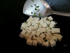葱花炒香,加入豆腐翻匀,然后加盖焖1分钟(大火),让蒸气弥漫在锅中,充分杀菌。