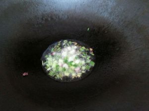 锅置火上,下2汤匙油炒热,放入葱花先炒香。