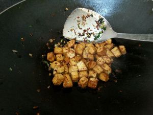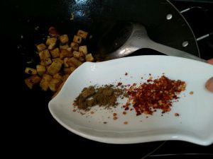 豆腐丁加入了孜然粉和辣椒粉,改中火,再翻动,令孜然粉产生香味即可盛出。