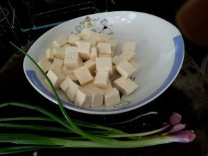 豆腐切丁,香葱洗净切花奋用。