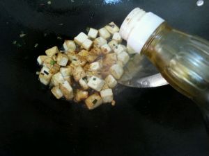 燃后打开盖子转小火慢慢煸,同时翻动把水蒸发掉,待豆腐丁表面变干时再加入2汤匙酱油和少许盐翻匀。