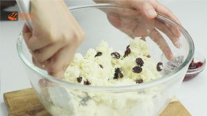 将淡奶油倒入容器,先倒一半,用刮刀随意翻拌几下,再倒入葡萄干