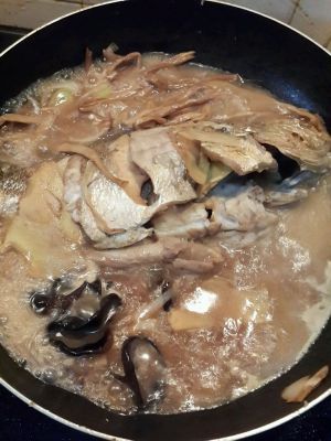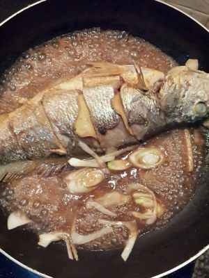 热锅,倒油 3秒钟双面煎鱼(腌鱼的汁不要倒掉)这个时候可能有火苗烧锅不用怕!两面煎好后倒入腌鱼的汁放葱花,滚起后放木耳黄花菜,5分钟即可