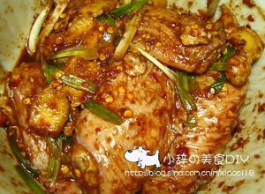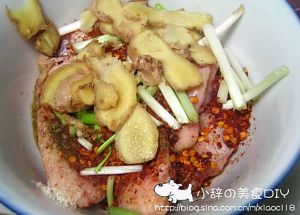 鸡翅洗净,放入姜片、蒜段,半勺盐、两勺酱油、四勺辣椒粉(喜辣的可多放点)、二勺孜然粉、一勺花椒粉,一勺鸡粉,四勺料酒腌制两小时左右