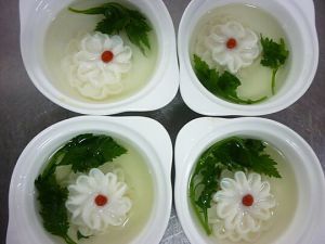 调清汤放入鱼茸菊花入盅,菊花叶焯水点缀即可