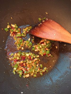 另外起锅,锅热放油,依次放入蒜、青椒爆炒