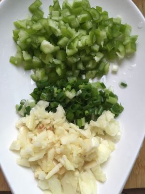 把青椒、蒜、葱切好备用