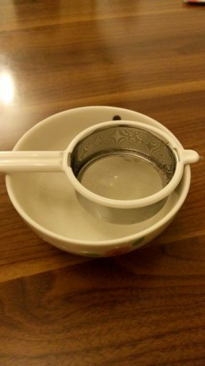 用很细的网篩走泡泡和未溶解的糖粒,倒入碗中