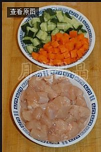 所有材料洗净,鸡脯肉拍松,切丁,胡萝卜去皮切丁,黄瓜切丁。