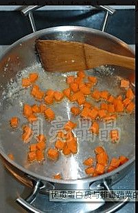 用余油煸炒胡萝卜丁,炒至胡萝卜身软,边缘透明