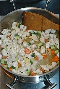 放入炒好的鸡丁,加适量盐和鸡精翻炒均匀。
