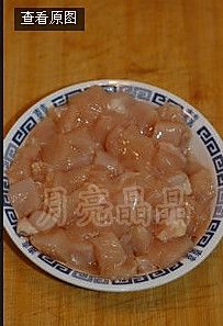 切好的鸡丁,用少许胡椒粉、料酒、蛋清、生粉抓匀后,加一汤勺食用油拌匀腌制一会儿。
