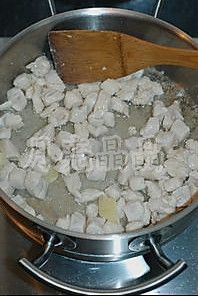 油温五成时放腌制好的鸡丁煸炒至表面变色出锅备用。