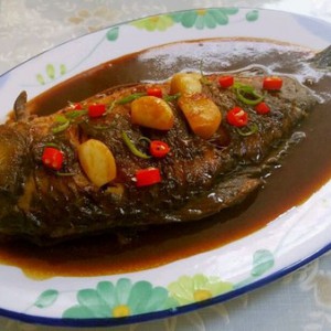 汤汁煮到一半时,用勺子捞出葱段和姜片不要,把鱼盛出装盘