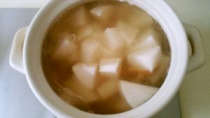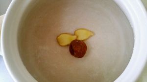 砂锅里一次性加入水,姜片和蜜枣,大火烧开