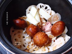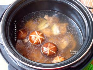 香菇洗干净,沥干水,百合洗干净;把所有食材放入锅中,加入适量的清水;大火烧开,转为小火慢炖45分钟;