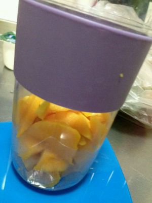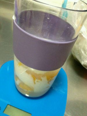 砂糖、柠檬汁、椰奶倒入料理杯中,打成泥状。
