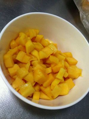芒果170g切丁,用保鲜膜封住碗口后放进冰箱冷藏室,以免氧化变黑。