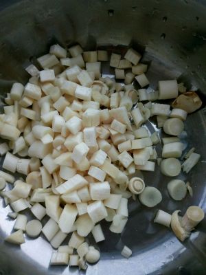 将蘑菇切成小段、块。香菇要焯水后切成小丁。葱花备用。