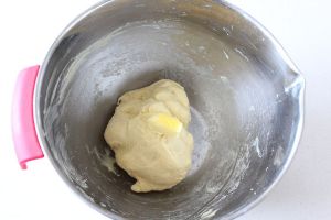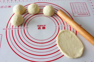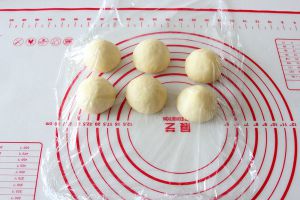 5.发酵好分割面团50克一个稍搓圆,盖上保鲜膜松弛五分钟