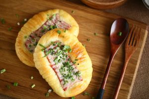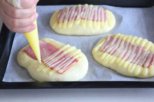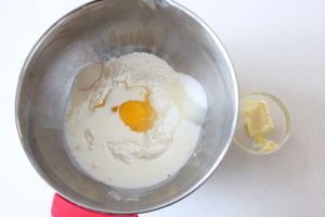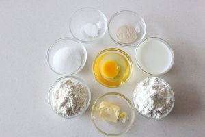 高筋粉:100克、低筋粉:50克、鸡蛋:50克、牛奶:35克、细砂糖:20克、细盐:2克、酵母:3克、黄油:15克