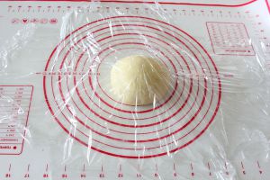 4.把面团稍微搓成圆,用保鲜膜盖上进行第一次发酵