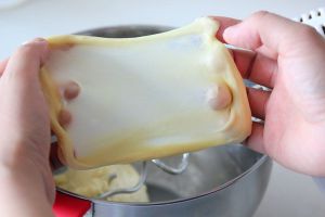 2.搅拌至能拉出稍厚粗糙的薄膜时裹入软黄油继续搅打